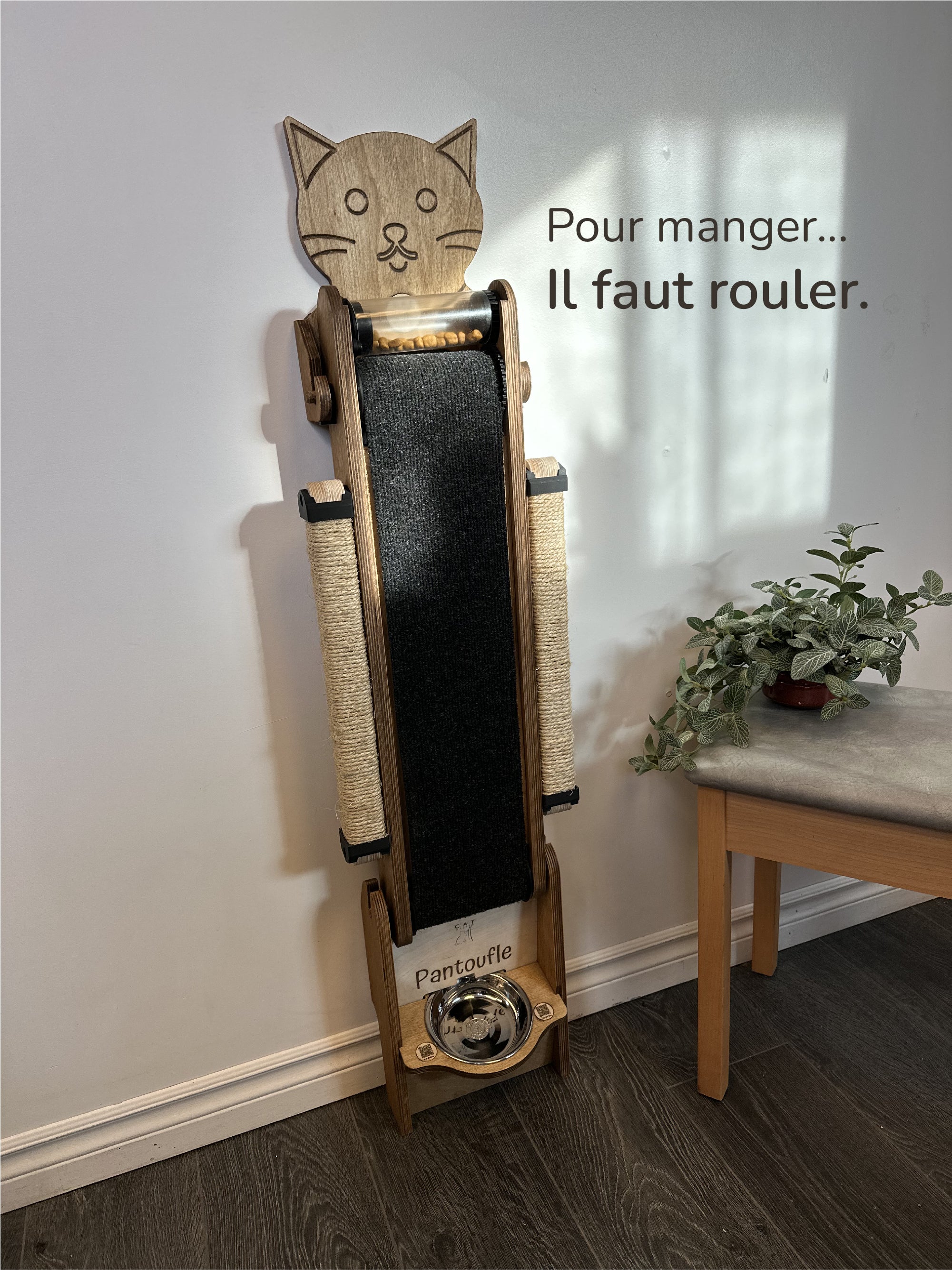 Le chat doit comprendre comment faire rouler le tapis pour obtenir ses croquettes. Chaque repas devient un petit défi.